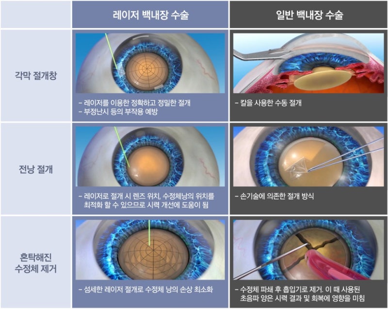 또한 개인의 난시를 레이저로 측정하여 절단하여 난시교정에 도움을 주며, 먼저 수정체를 분쇄하여 15분 이내에 빠르게 진행되어 내부 조직에 미치는 영향을 줄여 초음파의 사용을 줄입니다.