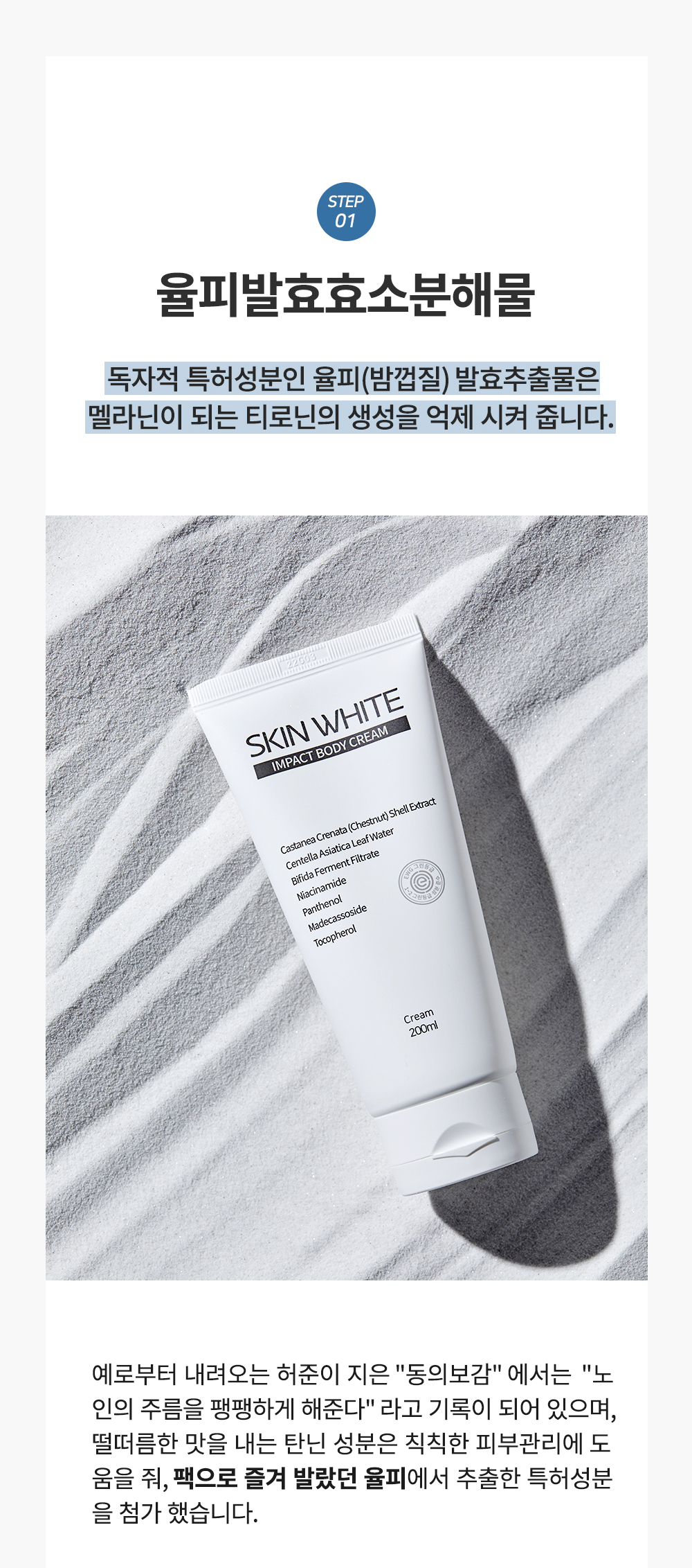 우리 피부는 위 사진처럼 멜라닌 생성으로 인해 과색소침착을 겪고 있는데, 스킨 화이트 임팩트 바디크림은 멜라닌을 3단계로 차단! – – -1. 멜라닌 2가 되는 티로신의 생성을 억제하기 위해 밤 껍질 발효 효소(밤 껍질)의 분해물을 첨가합니다. 다량의 마데카소사이드(호랑이 풀)를 첨가하여 멜라닌 생성 자극을 억제합니다3. 생성된 멜라닌이 표피로 이동하는 것을 억제하기 위해 식품의약품안전처에서 규정한 나이아신아마이드 최대함량 20,000ppm을 첨가하여