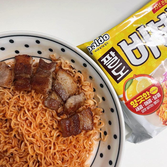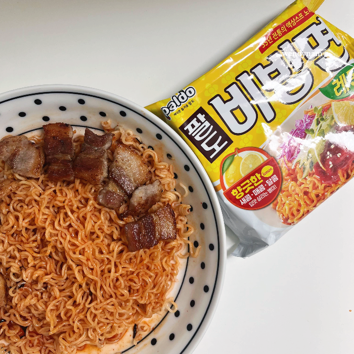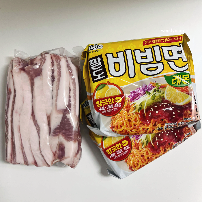 집에서 삼삼데이를 삼겹살과 레몬을 곁들인 팔도 비빔면으로 즐기던 시절의 추억!
