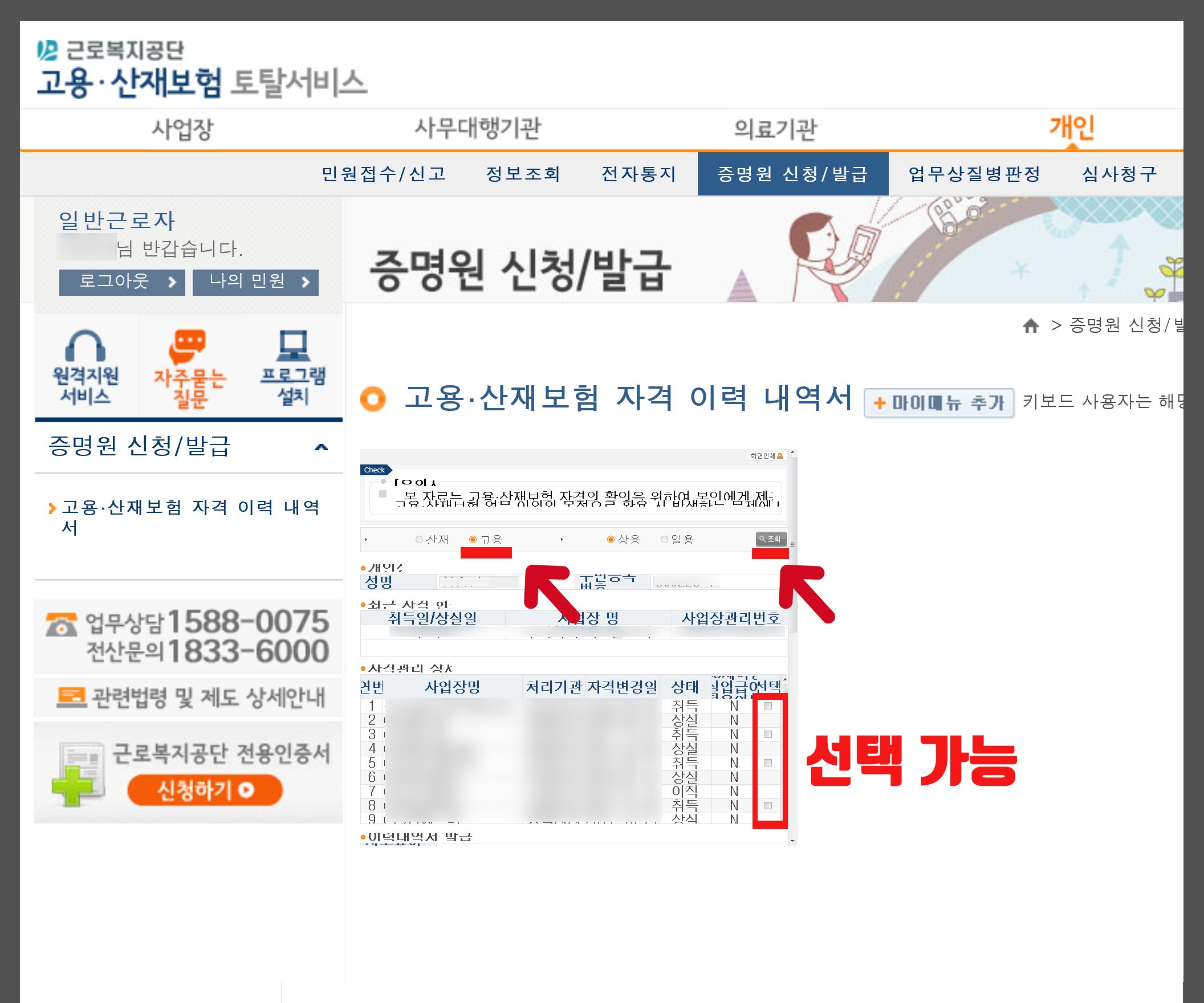 보험 구분 ‘고용’을 선택하고 오른쪽 [조회]를 누르면 최근 자격 현황과 상세 이력이 자동으로 조회돼 표시될 것이다.아래로 내려가셔서 [이력서 발급]에서 [고용/산재보험 자격이력서] 고용보험에 가입한 전체이력인쇄[신청]버튼을 누르다.