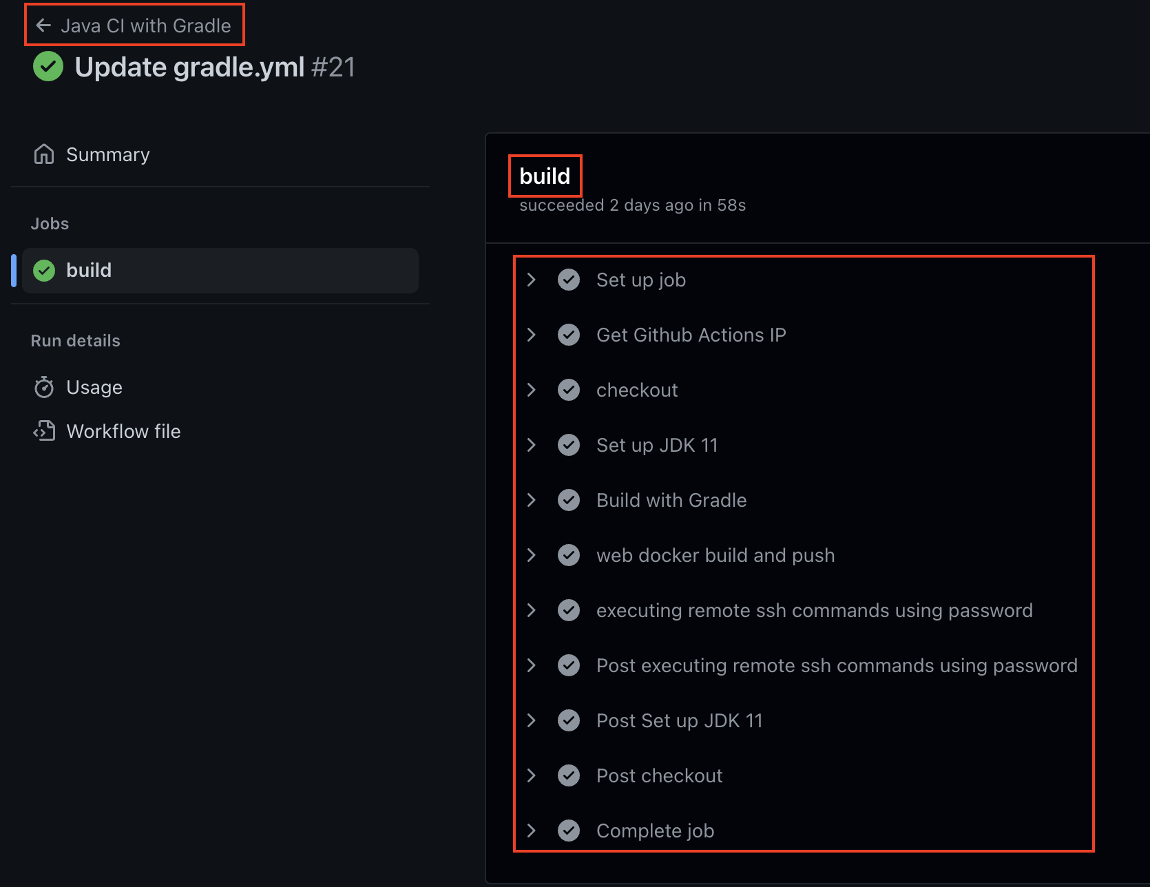 - Checkout, Set up JDK 11 등을 내가 제공한 이름으로 순차적으로 실행하면 어디에서 오류가 발생했는지 확인할 수 있다.