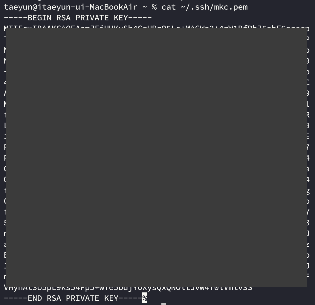 - 해당 PEM 키를 찾으려면 로컬에서 cat ~/.ssh/specified pem key name.pem을 검색한 다음 —–BEGIN RSA PRIVATE KEY—– ~~~ —–END RSA PRIVATE KEY를 검색합니다. —– 전체를 복사하여 붙여넣어야 합니다. 끝에 있는 “%”는 배타적입니다.