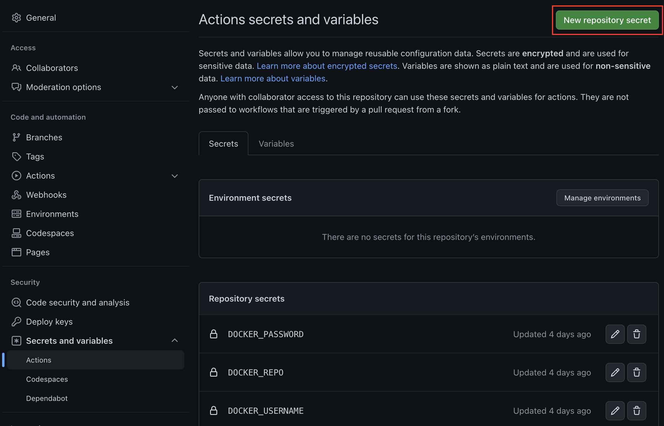 - ${{ secrets.DOCKER_USERNAME }}, ${{ secrets.DOCKER_PASSWORD }, ${{ secrets.DOCKER_REPO }} 세 가지 매개변수 모두 Github 저장소 비밀 탭에 삽입됩니다.