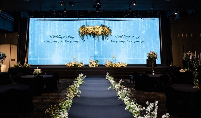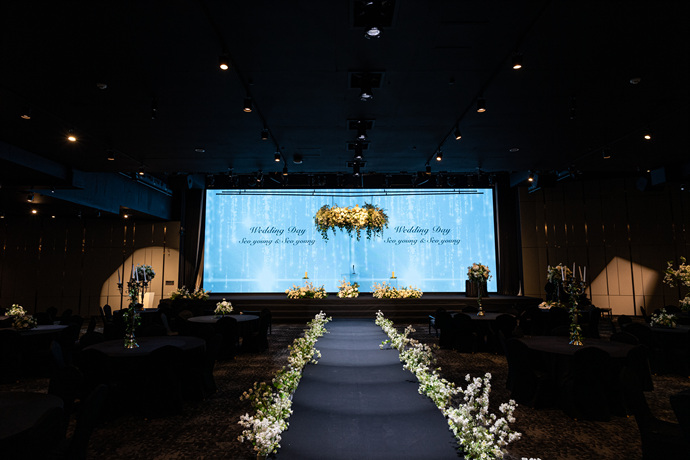 파크하비오 호텔 웨딩의 메인홀 포디엄 커튼 옆에 대형 스크린이 있어요! 다양한 행사를 열 수 있고, 웨딩 자체도 매우 드라마틱하게 보여요. 하하하 이거 정말 오래 기억에 남았어요~~~
